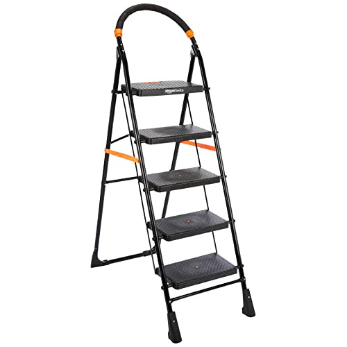 Amazon Basics Clamber - Foldable Step Ladder, Safety-Clutch Lock, Ribbed Steps, Knee Guard, Non-Marring PVC Shoes, 5 Steps (Steel, Black & Orange)