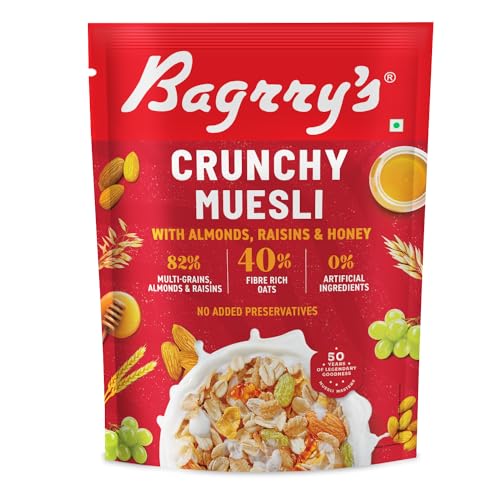 [Amazon Fresh] Bagrry's Crunchy Muesli | 40% Fibre Rich Oats with Bran | 82% Multi Grains, Almonds, Raisins & Honey | Breakfast Cereal | Natural Muesli , 400g /425g Pouch (Weight May Vary)
