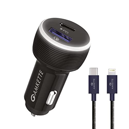 Amkette Power Pro 2 Port 36 Watts iPhone Car Charger with PD Type C and Quick Charge 3.0 & Free Type C to Lightning Braided Cable, 1 Year Warranty (Black)