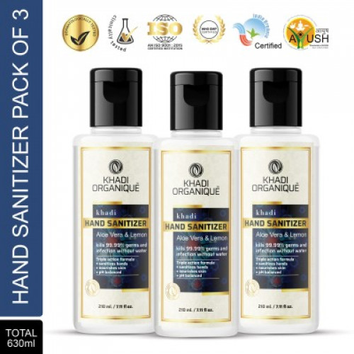 Khadi Organique kills 99.99% germs and infection without water with triple action formula sanitizes hands, pH balanced, nourishes skin Hand Sanitizer Bottle(3 x 210 ml) at just Rs.315 only
